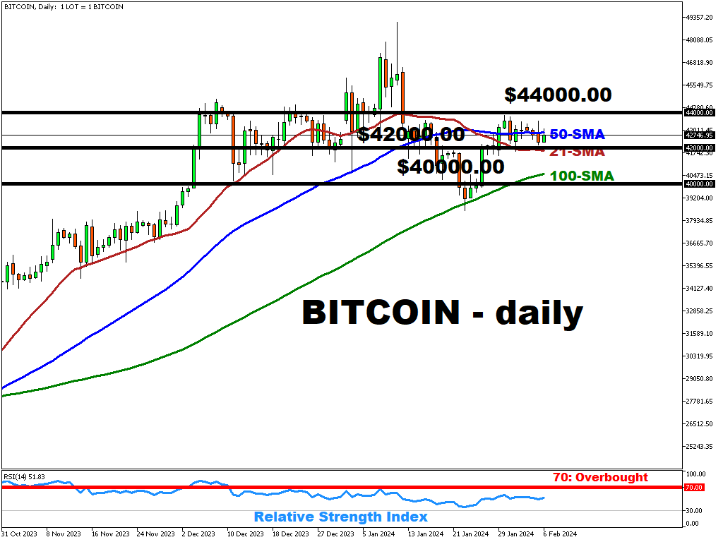 - An immediate support level is positioned at 21-period SMA (~41876). A break below it may pull bitcoin lower towards the 100-SMA (~40547), which is just above the psychologically important $40000 level