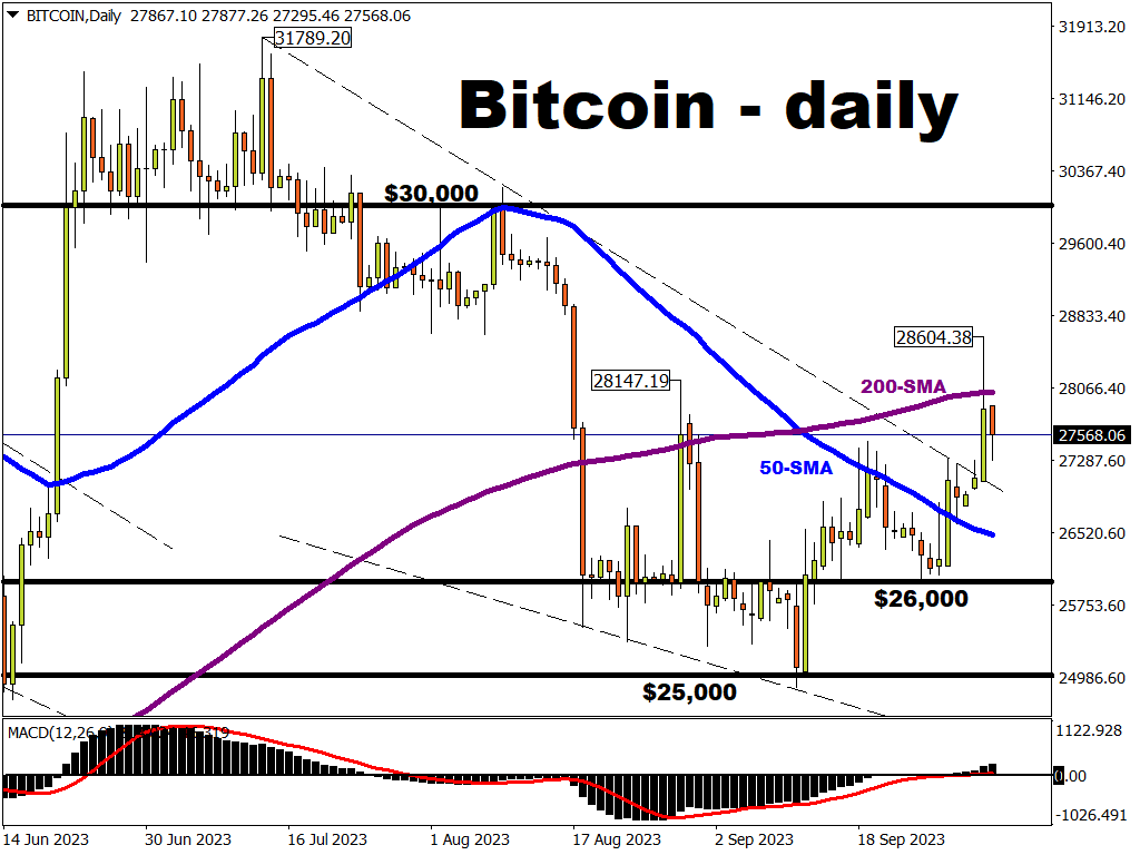 However, Bitcoin was unable to hold on to the psychological $28k handle, resisted around its 200-day simple moving average (SMA), before paring recent gains.
