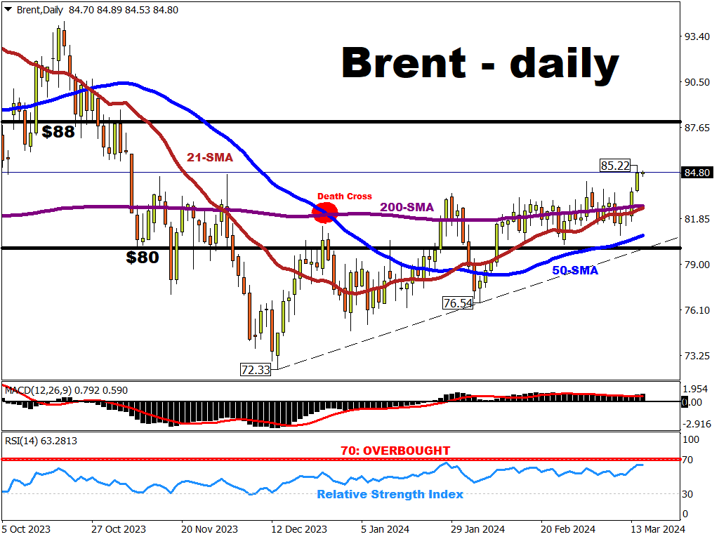 And with its 14-day relative strength index (RSI) yet to break into "overbought" territory, Brent may yet have more room to explore to the upside.