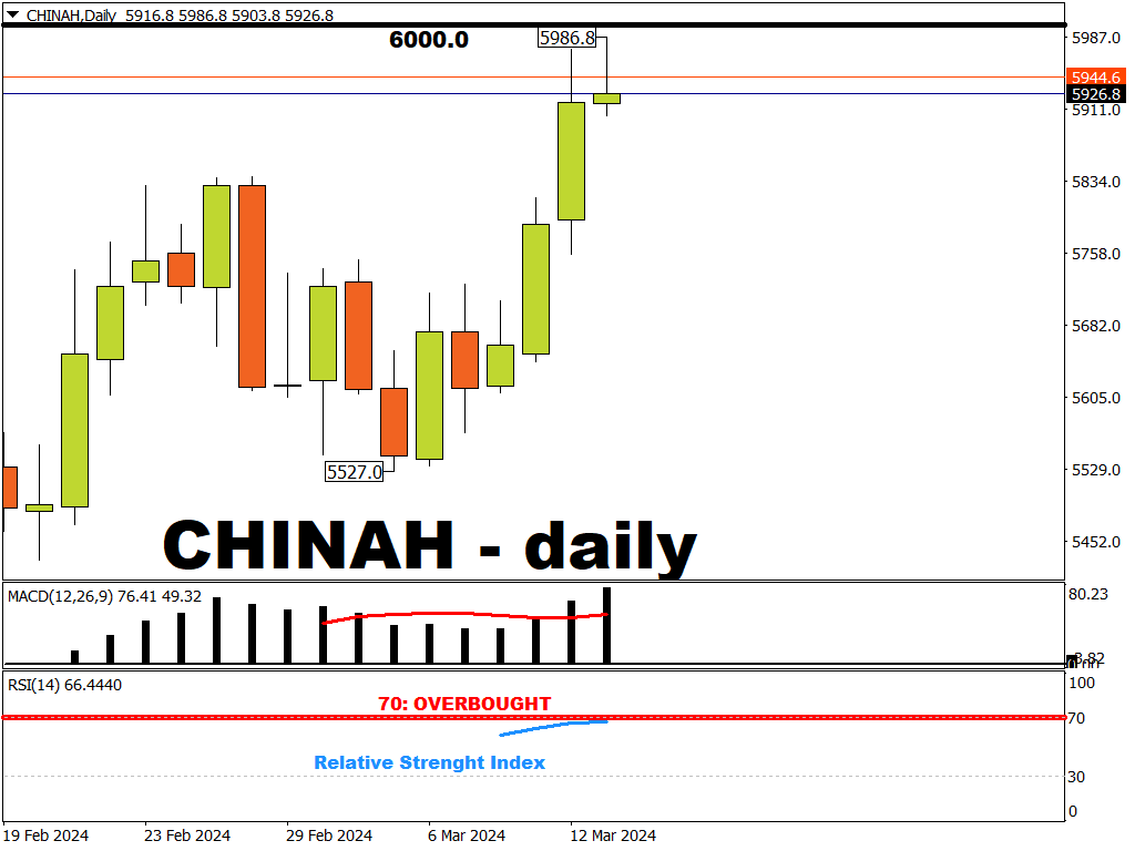 The CHINAH stock index has climbed by 4.5% so far in March 2024.