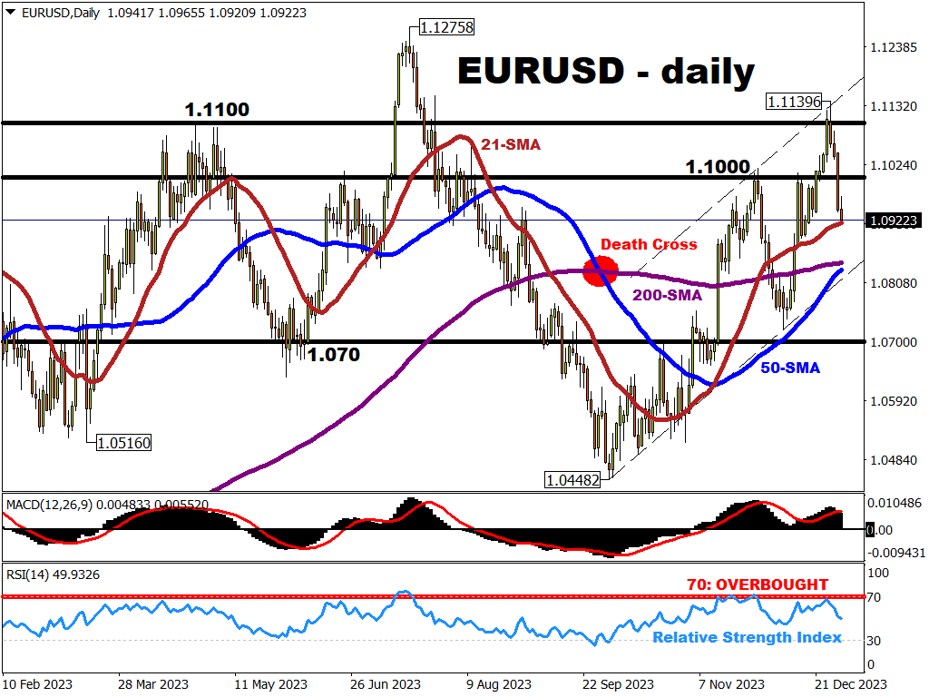 The last time we saw a "golden cross" for EURUSD was in late-2022, before this FX pair went on to claim a 3.12% annual gain for 2023.