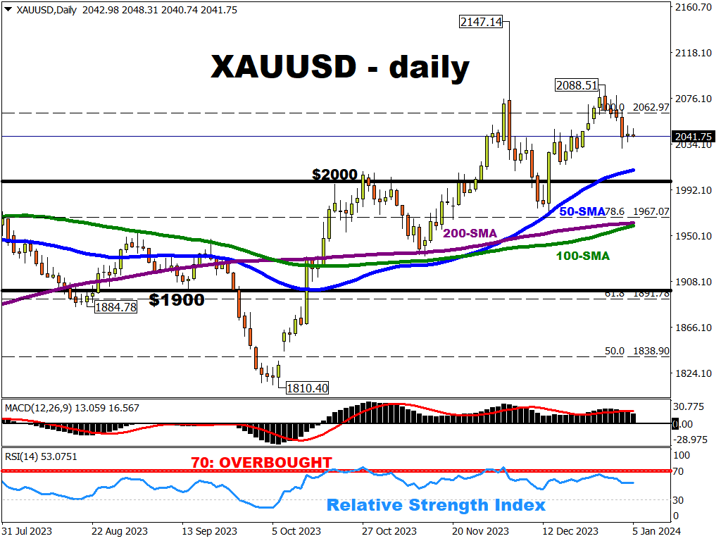 Spot gold is hovering around the $2040 mark, as markets await the incoming US nonfarm payrolls report (NFP).