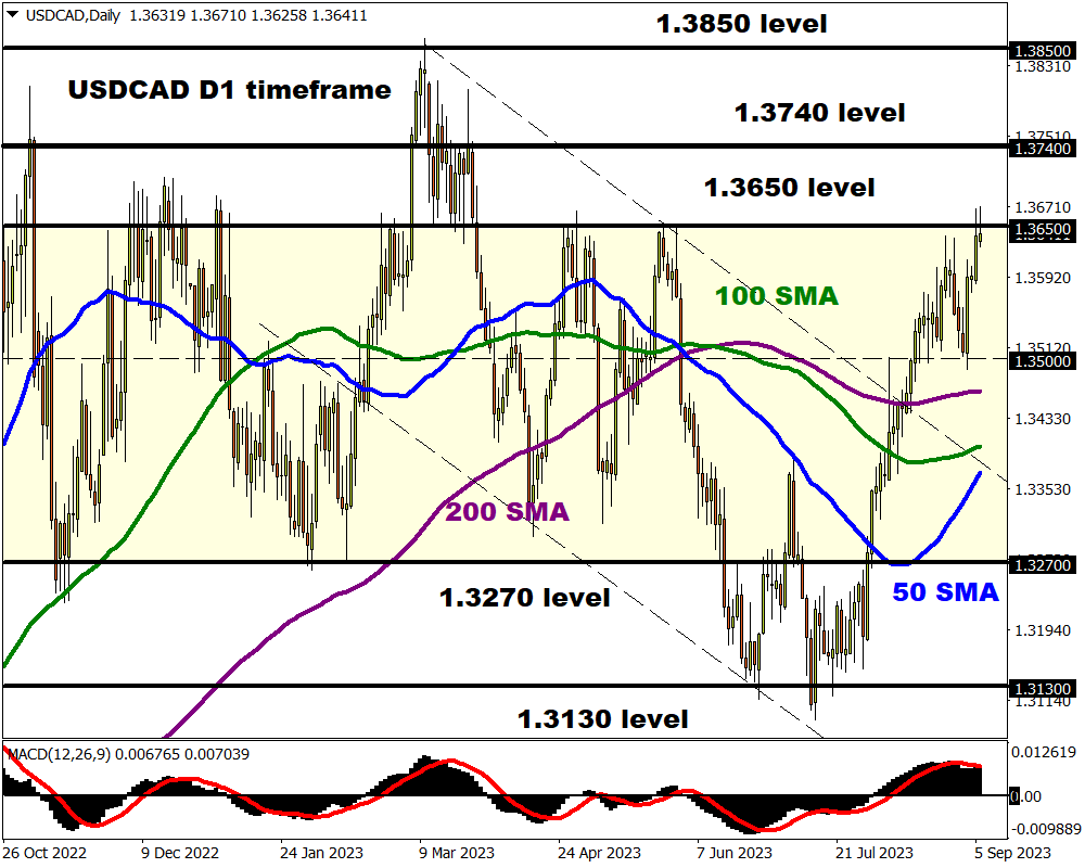 With the Bank of Canada rate decision around the corner, the USDCAD could see some heightened volatility today. It may be wise to keep a close eye on the 1.3650 resistance which has held since May 2023. A solid break above this point could trigger a further incline towards 1.3740. Any signs of weakness that take prices away from 1.3650 could invite bears to target 1.3500.