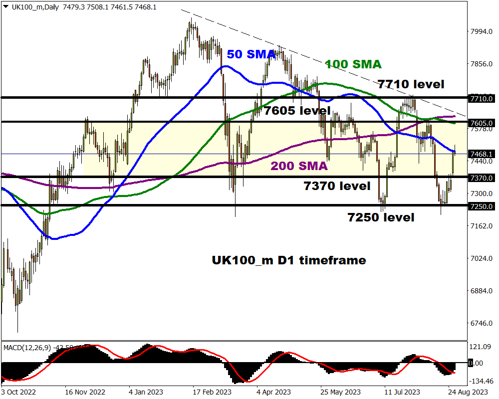 UK100 bulls seem to be back in town after rebounding from the 7250 support level. Prices remain within a wide range with key layers of resistance at 7605 and 7710, respectively. Should bulls conquer these key levels, the UK100 may start a fresh bullish trend. If prices are unable to push beyond 7605, a decline back towards 7370 could be on the cards.