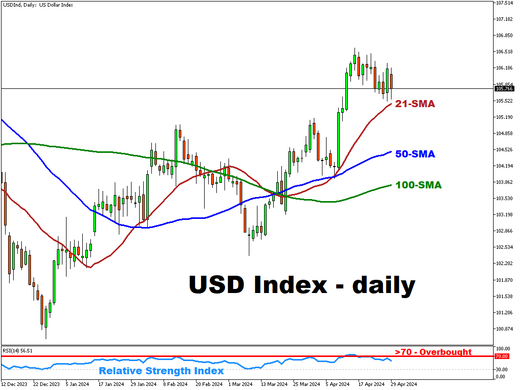 Economists predict that the US economy added 250,000 new jobs in April, the unemployment rate held steady at 3.8%, while wage growth stayed mostly flat. Stronger-than-expected jobs data, which underpin US inflationary pressures, may force the Fed to maintain rates at their current peak: a scenario that’s set to push USDInd higher.