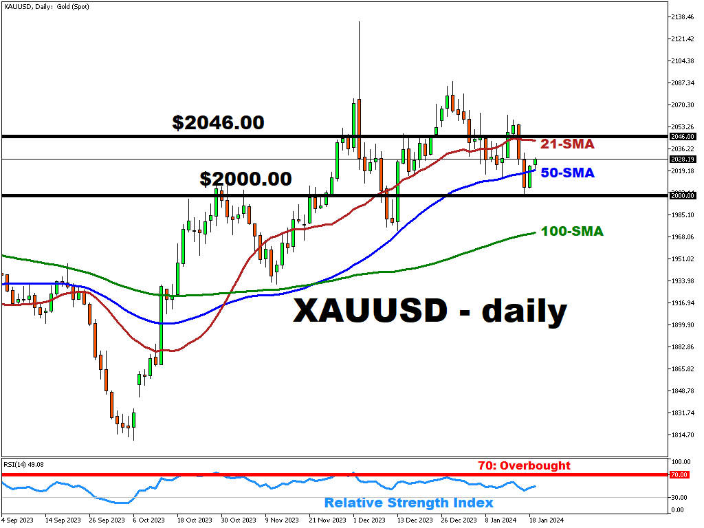 Gold prices have managed to rebound above 50-period SMA (~2019.897) as investors weighing the potential for a rate cut in the 1Q 2024.