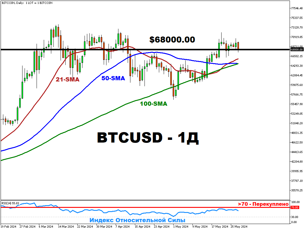 Курс BTC во вторник опускался ниже до $68000. За сутки основная криптовалюта сократилась на ~1,7%, за неделю - на ~4,5%.
